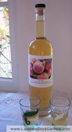 It’s been aging in the dark closet under the stair since July. This morning, finally, it was time for bottling. You do remember the peach liqueur we made, right? YOU did make it, right?, when the peaches were full of flavor and fragrance last summer?